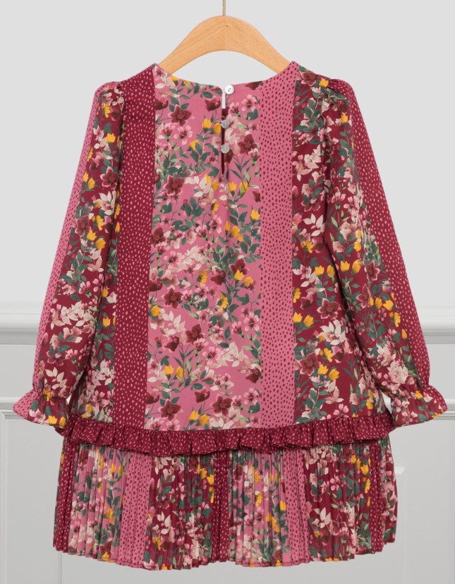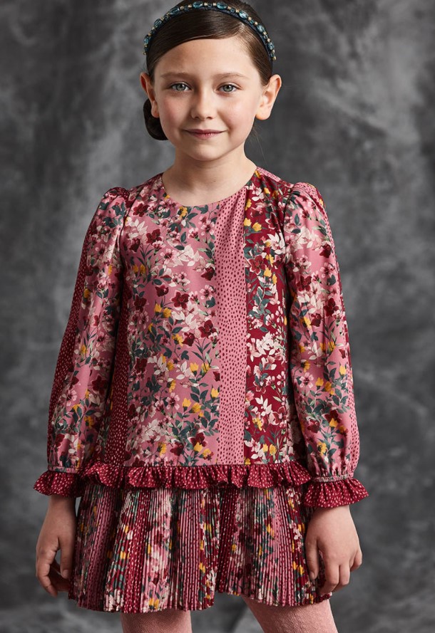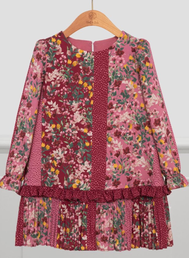 Descrizione: Delizioso abito in chiffon con stampe floreali. Fondo con rouches e dettagli plissettati. Un capo ideale da indossare in questa stagione autunno/inverno.
