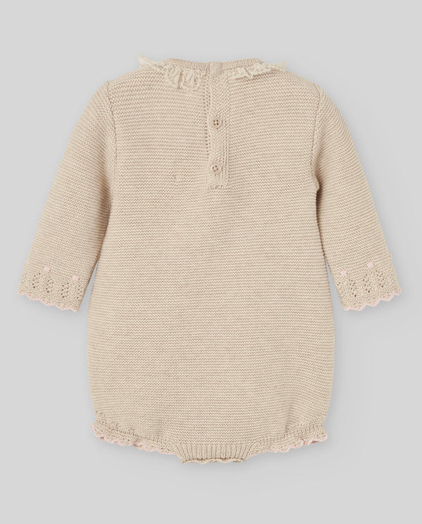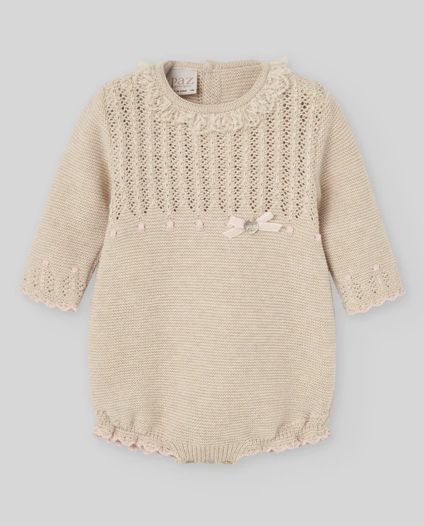 Tutina corta da bambina in maglia cotone-cashmere. Pettorina arricciata e colletto decorativo. Chiusura a pressione sul retro. Elegante e comoda.