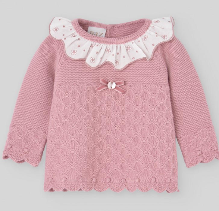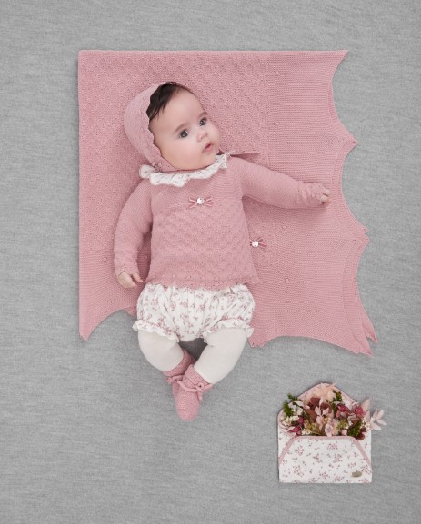 Descrizione: Cardigan per neonata in lana con un delicato colletto ricamato, che aggiunge un tocco di eleganza abbinato alla mutandina con grazioso dettaglio a nido d'ape in vita e delicato fiocco in velluto tono su tono. L'elastico in vita e le aperture per le gambe assicurano maggiore comfort