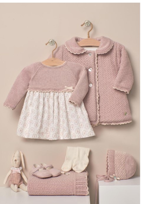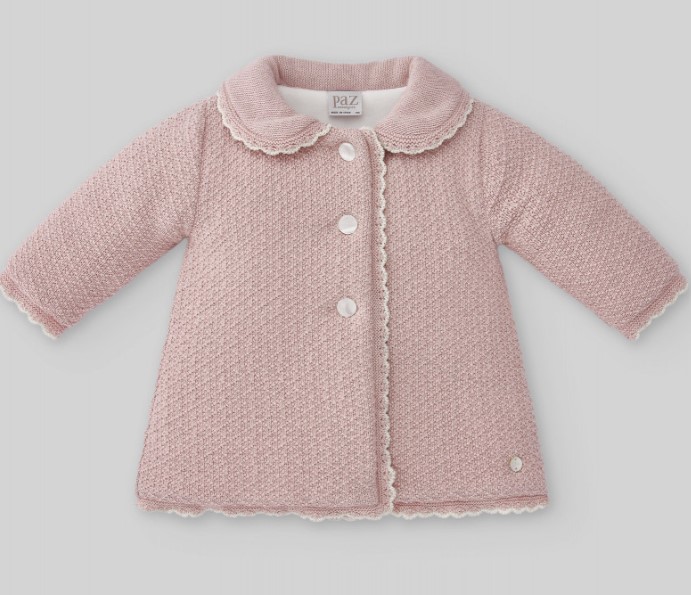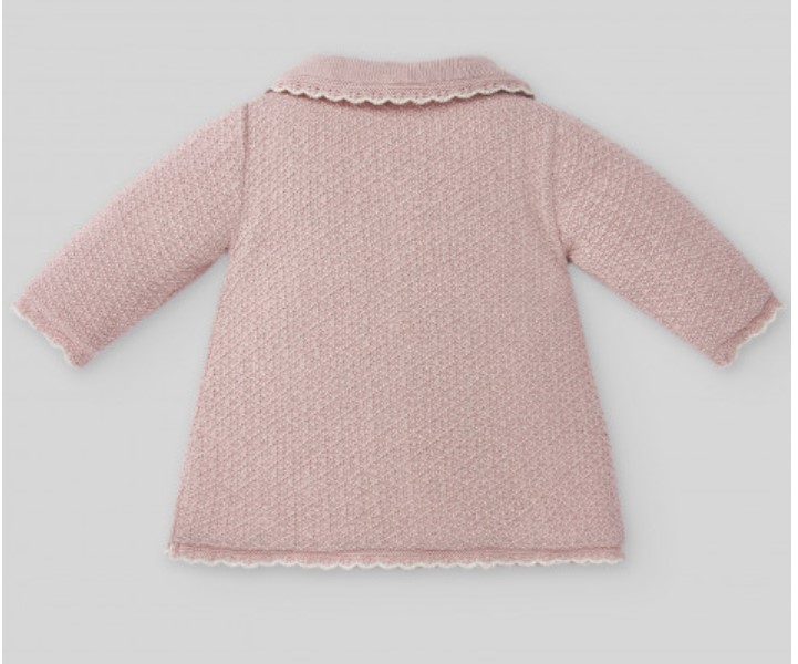 Cappotto in maglia di cotone e cashmere per neonata o bambina da 1 a 24 mesi, con collo bebè. Fodera interna in morbido tessuto felpato. Chiusura con bottoni abbinati. Rifinitura a contrasto a onde realizzata a mano.