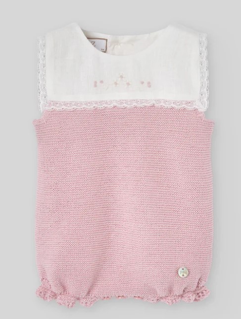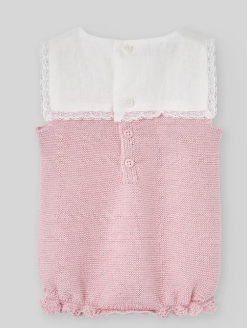 Pagliaccetto in maglia per bambina con corpo in maglia rosa e carré in lino con ricamo floreale e bordo in pizzo.