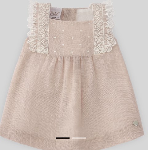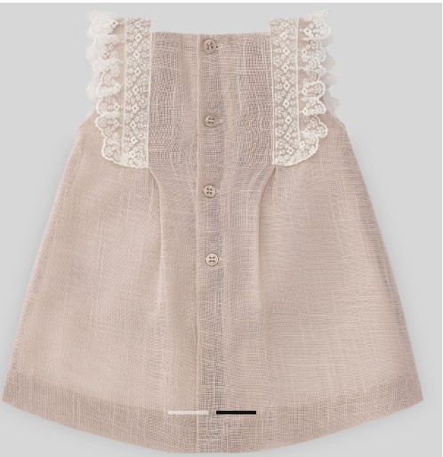 Descrizione: Vestito in cotone e lino lavorato con pizzi e lorze. Dettaglio sulle maniche con pizzo e fiocco con targhetta personalizzata. Chiusura posteriore con bottoni in tinta.