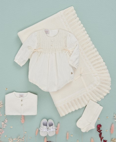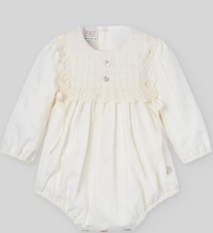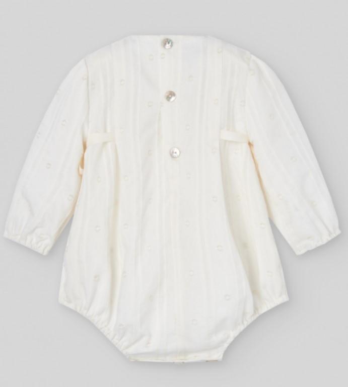 Descrizione: Tutina corta per neonati, perfetta per cerimonie ed eventi speciali. Realizzata in organza ricamata a pois. Dettaglio di smock a nido d'ape sul bavaglino con bordo in pizzo e fiocchi su entrambi i lati. Scollo rotondo. Chiusura posteriore con bottoni abbinati e al cavallo, per facilitare il cambio del pannolino